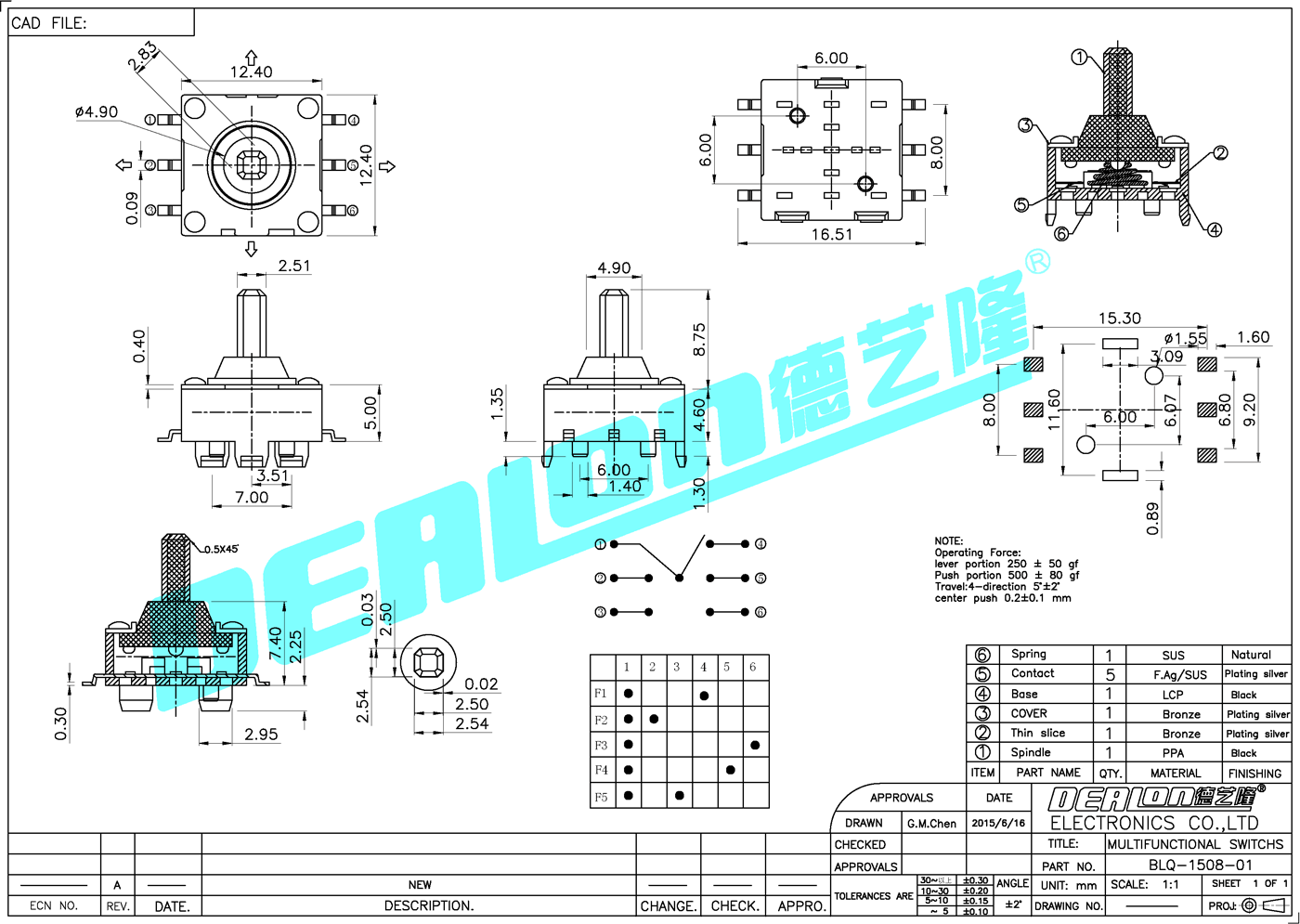 多功能開關(guān),型號BLQ-1508-01,尺寸:12.4mm*12.4mm,由德藝隆精密工業(yè)股份有限公司研發(fā)生產(chǎn)。自主開發(fā)產(chǎn)品包括多功能開關(guān)、輕觸開關(guān)、檢測開關(guān)、滑動(dòng)開關(guān)、帶燈輕觸開關(guān)、按鍵開關(guān)、微動(dòng)開關(guān)、耳機(jī)插座、DC插座等。